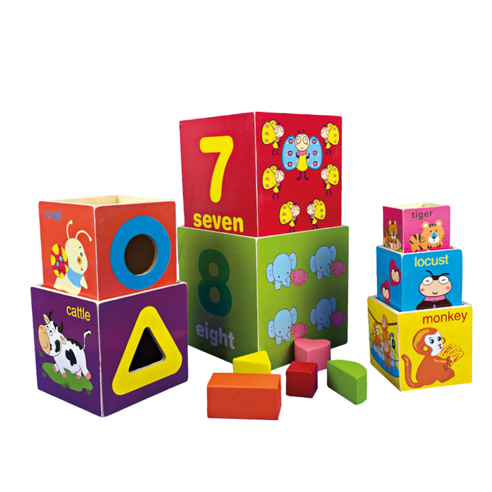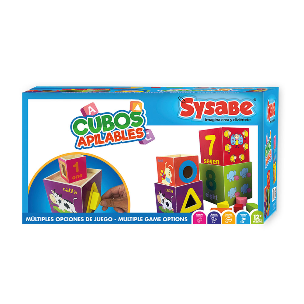 • Cubos coloridos apilables para insertar figuras geométricas.